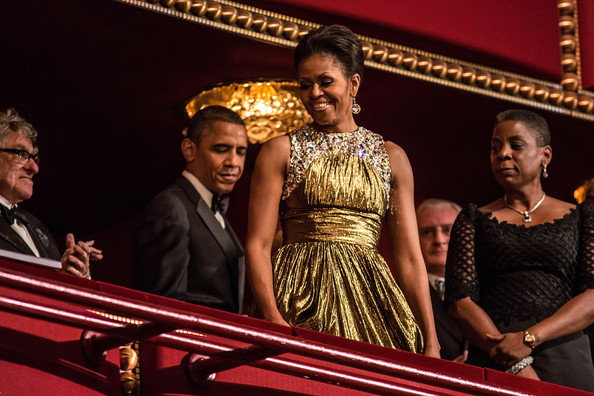 Michelle Barack obama herself looked dazzling and joyful in a silver lamé chiffon rhinestone-encrusted dress from Eileen Kors' hotel 2013 collection.